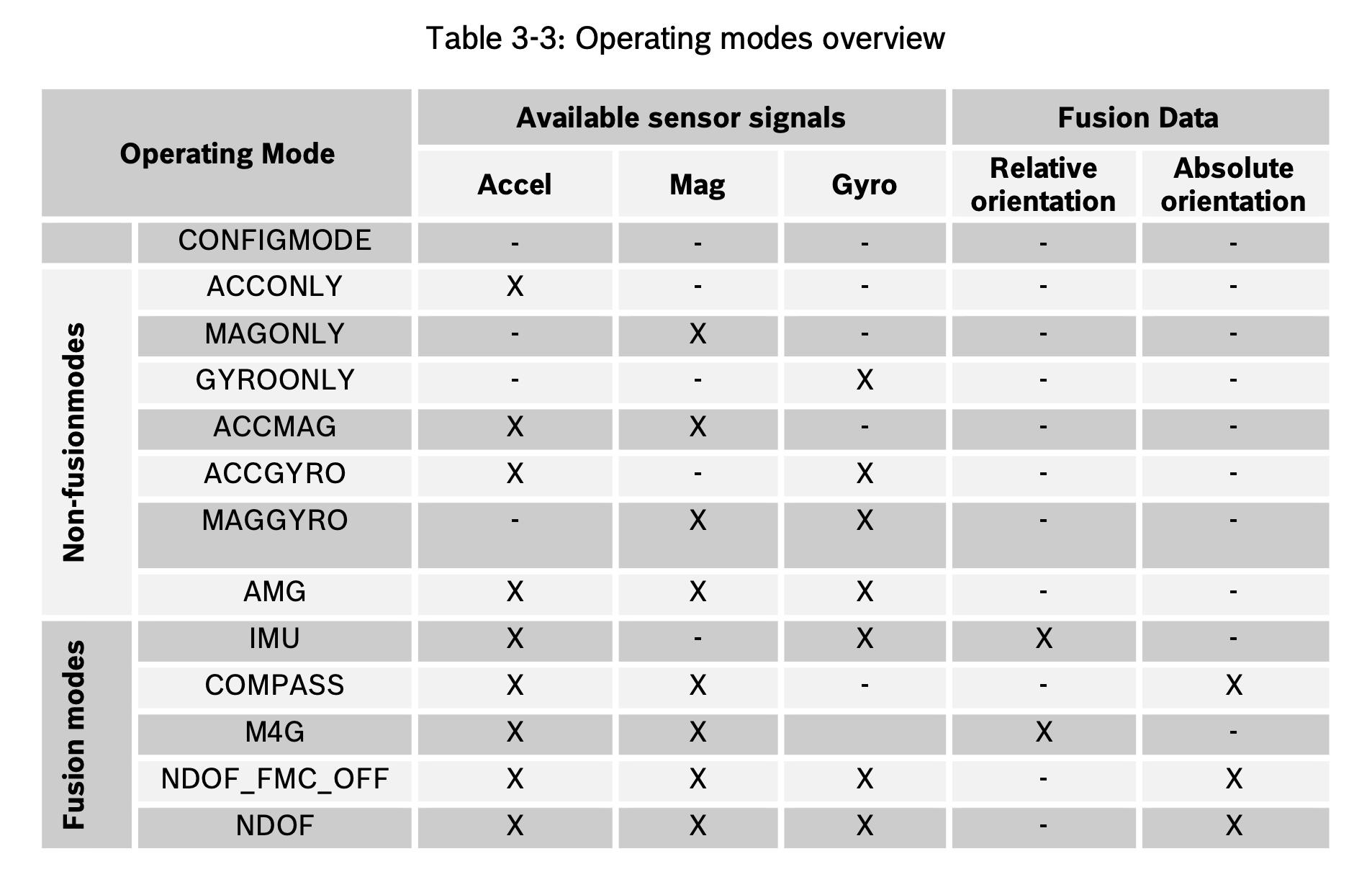 BNO055には複数の動作モードが存在します。こちらはデータシートからの引用です。